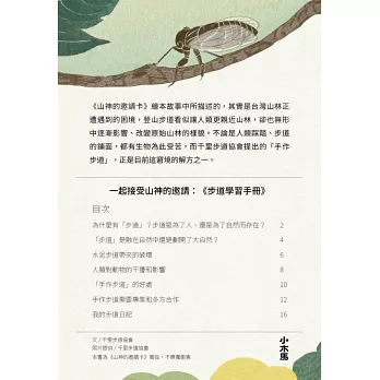 附有《步道學習手冊》深入說明手作步道、步道學之相關知識,由十八年來培育出40個種子師資、23位實習步道師、9位步道師、3位資深步道師、12位榮譽步道師的千里步道協會專業審訂。