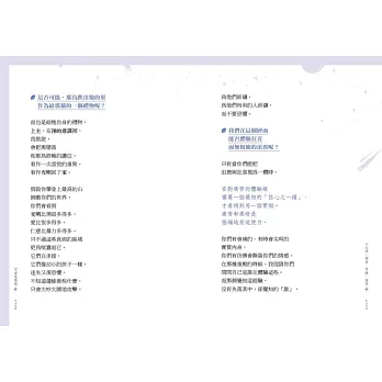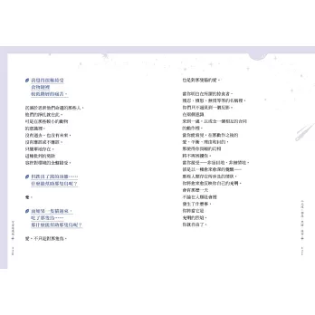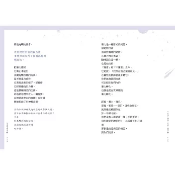看這本書之前,我並不知道它到底好不好,書的封面上說,這是與「賽斯」書(我譯過其中《靈界的訊息》、《靈魂永生》等)並列的書,作為對我們內在精神和外在世界一個愉快的、無價的嚮導。當我展卷細讀時,立即為它兼有詩的深奧簡潔和散文的流暢清明文風吸引,被它溫柔地牽引到一個遠在天外,又近在我心內的神祕之鄉。彷彿在風和日麗之下,觀賞一片奇花異卉,卻驚喜地發現,原來它們都綻放在我的心園裡。我沉醉其中,徘徊留連。當我看完這本書,已用彩筆勾劃,又夾紙條又摺角地把它弄得不成樣子。我把其中最精采的片段講給摯友胡因夢、孫春華等人聽,她們都異口同聲地說:太好了,值得放入「新時代」系列。於是我又一頭栽入吃力不討好的翻譯工作。
