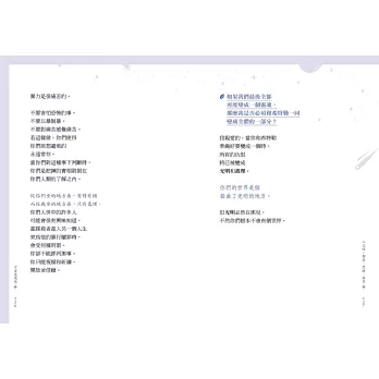 說實在的,這是一份沉浸在「愛」中的工作,翻譯途中,我又再三地感受到伊曼紐送給我們愛的訊息而歡欣感激不已。我覺得我被繳了械,不,應該說是心悅誠服地投降,毫不抗拒地打開了我的心,讓所有的愛流進來,而不再以為自己不配。在生活中,我也有了改變,我也盡量把那份輕鬆自在的喜悅帶進去,不再固執地苛求自己和別人。而別人給我的一切關愛,我也默默地懷著感激之心,照單全收,點滴在心頭!我發現自己真富足,真有福。同時,我也把愛給出去,不害怕不計較,愛是唯一越給越多的東西。