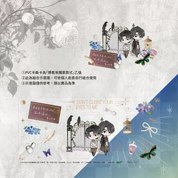 3. 隨書贈送的PVC裝飾卡有覆膜,請自行撕除。卡片的小圖拆下後就無法裝回去,請妥善保管,遺失不補。
