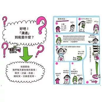 《好好說話,到哪都是人氣王!》正是我所讀過的圖文漫畫中,相當稀有的絕佳作品。本書內容豐富,除了涵蓋溝通最重要的口語溝通雙向技巧——清晰的自我表達與積極聆聽別人之外,也呈現溝通時連帶相關的重要細節,如:肢體語言、聲音語調、掌握不同關係的身體界線、適度保留談話中的空白片段……等,還囊括了幽默感這項超級有效,卻經常被忽略的溝通元素。