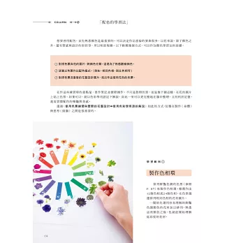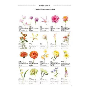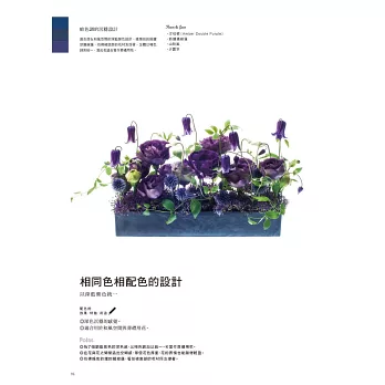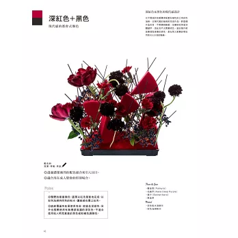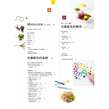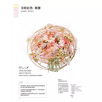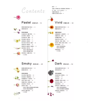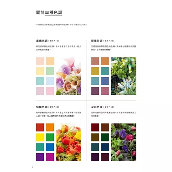 本書介紹花材配色最常也最容易使用的四種色調:柔嫩色調、煙燻色調、鮮艷色調、深暗色調。四種截然不同的顏色組合,適合搭配不同的場合,或贈送給不同年齡性別的人。