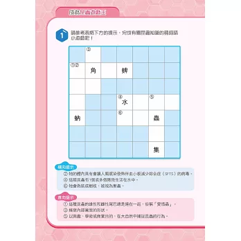 小百科單元介紹最完整的昆蟲生態小檔案,並且搭配精美圖片詳細解說專有名詞、揭祕雌雄昆蟲的差異、多樣化昆蟲的特色、補充延伸知識與有趣的冷知識,讓小讀者掌握昆蟲生態的完整資訊,再以小遊戲來複習知識和加深印象,藉此在趣味中學習。
