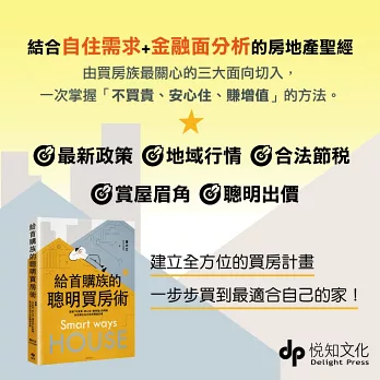 先建立正確觀念,再按照書中指引來實際操作,從推算可負擔房貸、盤點隱形成本,到辨識預售、新成屋、中古屋優劣,讓你不再「空等房價下跌」,而是一步步買到最適合自己的家。
