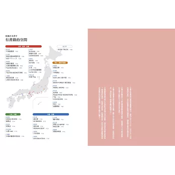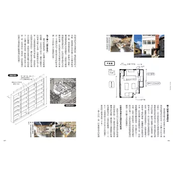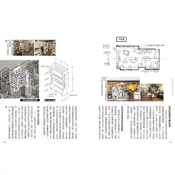 除 了實地量測,作者也採訪經營者,不只記錄了空間,也記錄了所在建築的起源、改造過程的故事。書中大部分的空間都經過翻新,利用過去的建築結構,結合經營者的巧思,創造出美妙的閱讀空間。一個獨特的書架、一個被書包圍的空間,都是書與人相遇的地方,展示著經營者的精選書籍與世界觀。空間是經營者的心願,是在地的記憶,也是故事的結晶。
