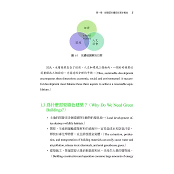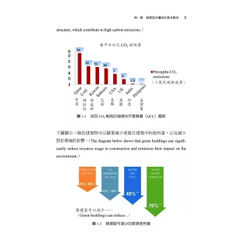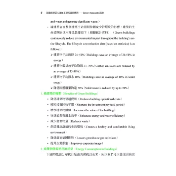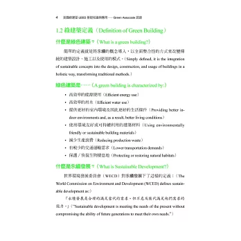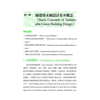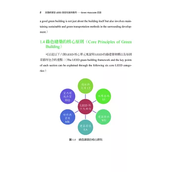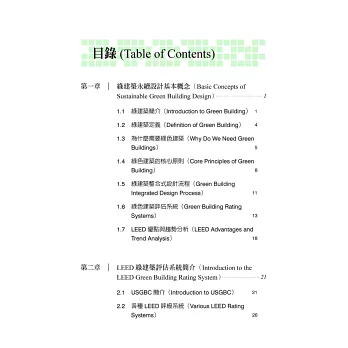 本書是全台灣第一本專門針對美國綠建築評估體系介紹的中文教材,隨著全球氣候變遷與環保意識的抬頭,越來越多人重視綠建築的設計理念。在台灣,除了本土性的EEWH 評估系統外,也相當多的建築物希望取得LEED 認證為其加分,以增加其國際的市場。更因如此,越來越多的建築相關從業人員朝著LEED 專業認證人員邁進,而LEED 認證考試雖然已於2014 年前開放了中文輔助語言,但是由於缺乏相關教材與資料,也讓很多有心想認識或準備LEED 考試的夥伴有了閱讀語言的障礙,也因此我與巧文老師開始將資料整理成中英對照的模式,以方便讀者學習。