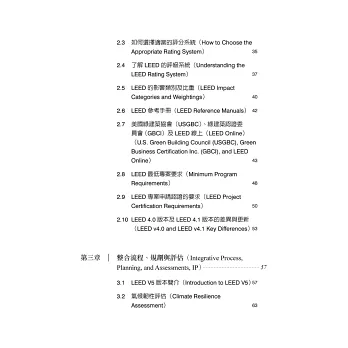 最後希望讀者可以使用本書於LEED 系統的學習,或是用來針對LEED 認證考試當作學習的材料。本書附錄有詳盡的考試步驟說明與中英文專有名詞對照表,相信對要考試的讀者有相當大的幫助。末了祝各位學習順利,並順利取得LEED 認證人員,一起為永續的環境設計盡一份心力!