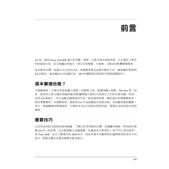 「本書從介紹最基本的Git概念逐步深入至高階用法,因此既能滿足新手讀者,也適合經驗豐富、尋求技巧和訣竅的使用者需求。」 —Jeff King,Git貢獻者,開源開發者