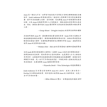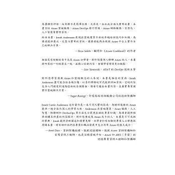 閱讀本書將會是一趟Azure奇妙之旅,既適合新手、也適合高手去追求的雲端寶藏。這是本全方位指南,指引初學者一條康莊大道,也是經驗豐富的專業人士之隨身寶典。 ——Peter T. Lee,Capgemini America管理交付架構師