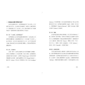 我們都覺得AI很迷人,但更有趣的是,AI與所有成功公司皆具備的商業策略和商業模式、關鍵流程、組織和變革管理,以及原有技術架構之間的互動。開發好用的新演算法 是了不起的成就,但更了不起的是成功執行納入AI的重大 企業變革計畫。我們喜歡與使用科技(特別是AI)的組織 合作,以及書寫他們的事蹟,藉此發現新的競爭與經營方式。你將會在書中讀到這類故事。