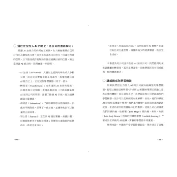 本書將聚焦在AI問世前就已存在的大型企業,如何在AI的協助之下轉型。與其贅述一般或最常見的AI應用方 式,我們會剖析全力投入AI的公司,他們都下了龐大卻明智的賭注,希望能藉由AI大幅改善公司狀況,而且有證據顯示這些賭注已得到回報。我們用各種方式形容這些公司全力投入AI的作法,像是「AI加持(AI fueled)」、「AI驅動(AI powered)」、「AI賦能(AI enabled)」等。但這些公司 都有一個共同點,就是在AI技術的支出、規劃、策略、實施和變革方面,他們都屬於前段班。不是所有公司都會選擇如此充滿野心的作法,但我們認為所有人都可以從中學習, 甚至可能得到啟發。