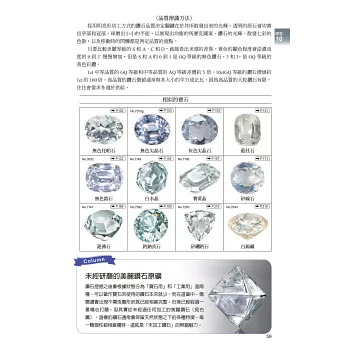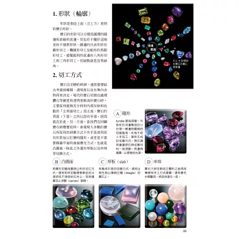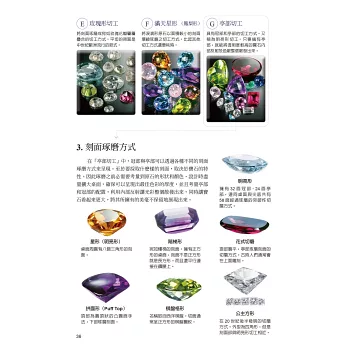 2.展示超過80種礦物,將近200種寶石原石、切石和鑲嵌首飾照片,並收錄了類似寶石、人造石及模造品供比對辨識其差異,是鑑賞寶石的最佳工具書。