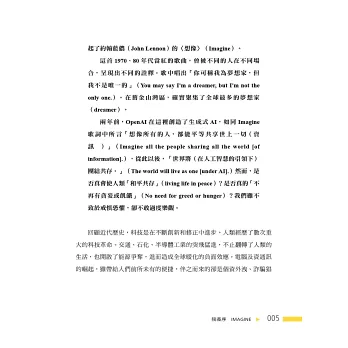 兩年前,OpenAI 在這裡創造了生成式AI,如同Imagine歌詞中所言「想像所有的人,都能平等共享世上一切(資訊)」(Imagine all the people sharing all the world [ofinformation].),從此以後,「世界將(在人工智慧的引領下)團結共存。」(The world will live as one [under AI].)然而,是否真會使人類「和平共存」(living life in peace)?是否真的「不再有貪妄或飢餓」(No need for greed or hunger)?我們雖不致於戒慎恐懼,卻不敢過度樂觀。