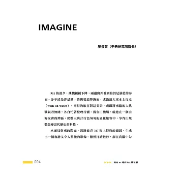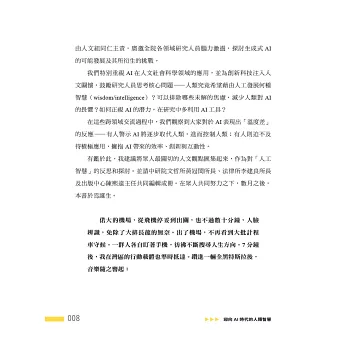 有鑑於此,我建議將眾人最關切的人文觀點匯集起來,作為對「人工智慧」的反思和探討。並請中研院文哲所黃冠閔所長、法律所李建良所長及出版中心陳熙遠主任共同編輯成冊。在眾人共同努力之下,數月之後,本書於焉誕生。