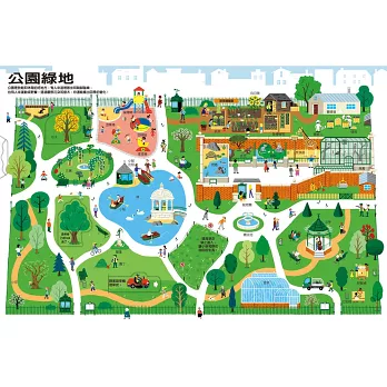 翻開「公園綠地」,拉一下割草機幫公園的草地除除草;樹木在四季裡的變化是什麼樣子呢?哇鳴~公園裡有一棵300多歲老樹!工人們是如何把蜜蜂採回來的花蜜收集起來?