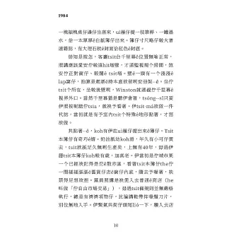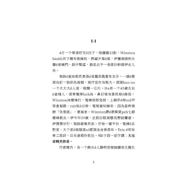 4月一个寒凊好天ê日子,時鐘霆13點,Winston Smith共下頦勼倚胸坎,閃覕歹毒¬ê風,伊軁過勝利大樓ê玻璃門,跤手緊猛,猶是去予一卷塗沙粉綴伊走入來。