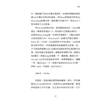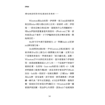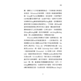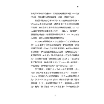 巷路ê氣味敢若煮過ê高麗菜濫舊布苴仔。一頭ê壁頂有釘一張彩色海報,展佇室內有較大。頂頭kan-na一个大大大ê人面,較闊一公尺。He是一个45歲左右ê查埔人,頂脣鬚厚koh烏,鼻目喙有寡性格ê緣投。Winston向樓梯行,電梯試都免試,上順序ê時mā罕得會振動,tsit站ê日時,電規氣切掉矣,因為當咧備辦「仇恨週」,著減省。Winston蹛ê厝間愛peh七節樓梯起去。伊今年39歲,正跤目較頂懸有靜脈爛瘡。伊慢慢仔行,規路歇幾若改。佇每一層平台,電梯ê正對面,大个面ê海報就uì壁頂金金看落來。Tsia-ê相有專工設計,目光會綴你徙位。相ê下跤一逝字講:大兄哥咧共你看。