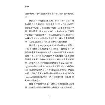 佇厝間內,有一个飽水ê人聲咧唸規捾關係生鐵生產ê數字。聲音來自一塊長篙形ê金屬枋,若像暗霧ê鏡,鬥佇正手爿ê壁頂。Winston捘一粒開關,音量小降--lueh,猶是逐字聽有。Tsit个裝置號做「千里幕」(telescreen),聲會當捘細,毋過禁袂掉。Winston行去窗仔邊,玻璃照出伊細漢、荏身款ê體格,伊穿連褲ê藍色作穡衫,tse是黨ê制服,予伊看著koh較薄板。伊頭毛金sih-sih,面血色自然。皮膚粗粗,是bái質ê sap-bûn、無利ê喙鬚刀和拄才收尾ê寒人剾--ê。
