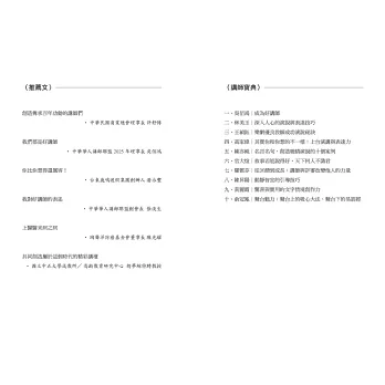 匯集十位超級講師深厚的功力,透過系統化的指導,幫助講師從定位、表達、教學方法、情緒管理到持續成長,全面提升教學能力。無論是日常分享、升學推甄、公司面試、新手講師還是有經驗的教育工作者,都能從中獲得寶貴的啟示與實用的技巧。──吳佰鴻 (中華華人講師聯盟 第十五屆理事長)