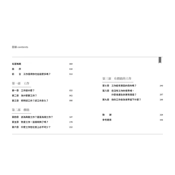 在這本內容豐富、引人入勝的書中,作者暢談從哲學家亞里斯多德對工作的思考,到歌手桃莉.巴頓等名家看待工作的見解,引導讀者思考一系列關於工作意義和人生價值的深刻問題。書中並不提供我們一個適用於所有人的答案,而是以深度同理心和洞察力,訴說每個真實人物和他們的工作故事。極力推薦!──瓦萊麗.提比略(Valerie Tiberius),明尼蘇達大學保羅.W.弗倫澤(Paul W. Frenzel)文學講座主席,《你想從生活中得到什麼?》(What Do You Want Out of Life?)作者