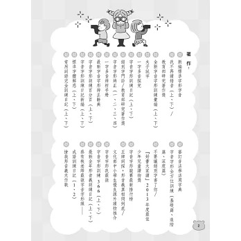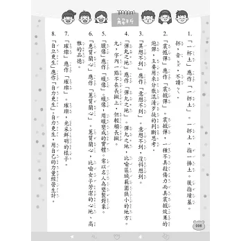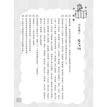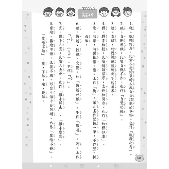 一般來說,孩子之所以常出現錯別字的毛病,大部分是對於字或詞義的掌握不甚了了。要知道,每個漢字都是一個有趣的知識,而每個字長成現在這個樣子必出有因,當讀者能了解每個字的意義,便能精準使用這些字詞,不但不容易寫錯字,而且還能幫助你表達得更為清楚。是以,本書就所羅列的語詞題庫多方查考相關資料之解釋,輔以筆者服務小學及指導競賽經驗,逐一精準,且言簡意賅進行解析,如「臭味相投」的「臭」,音讀「ㄒㄧㄡˋ」,指雙方志趣、性情相投合;而音為「ㄔㄡˋ」時,則意指譏諷人的興趣、性情相合,兩相比較,讀者自然能分辨在不同情境語意時,而能準確表達褒貶之不同讀音。又如「一仍舊貫」一詞,表示完全按照舊例行事之意,只要明白解釋,自然不會寫成「一仍舊慣」了。