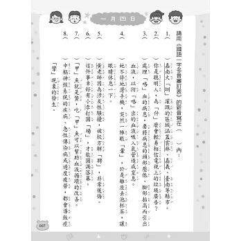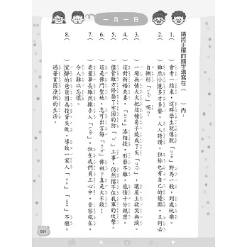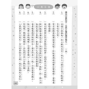 本書適用於中小學生,所選錄常見誤讀、誤寫、誤用語詞共近三千個,以日記型式編寫而成,每日八題,分屬「正確國字」、「正確字音」、「錯別字」、「國語一字多音審訂表的新音」、「名言、成語和諺語」、「同音字」和「多音字」七大題型,讀者倘能按部就班逐日習作,並熟諳其正確形音義,三百六十六天之後,要想達「向錯別字說拜拜」之鵠的,定能克竟全功。