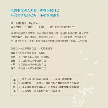 33個不勉強的真實故事,寫給說過很多違心話,做過很多違心事,卻依然不快樂的我們,願我們成為一個精神自足的人,不必依靠美貌、才華或者另一半,即使在失落、悲傷、打擊和孤獨後也能迅速治癒傷痛,把自己扶回正軌。在這5件事上不勉強自己,一起越來越好:
