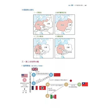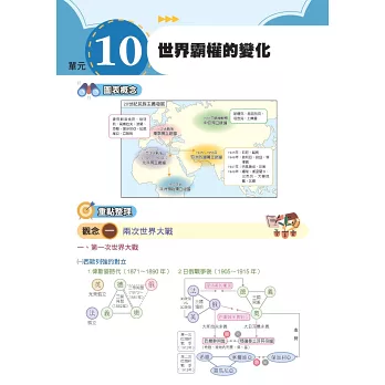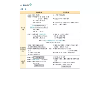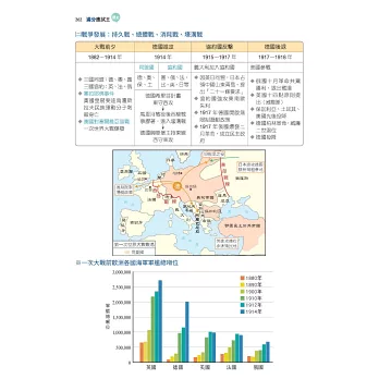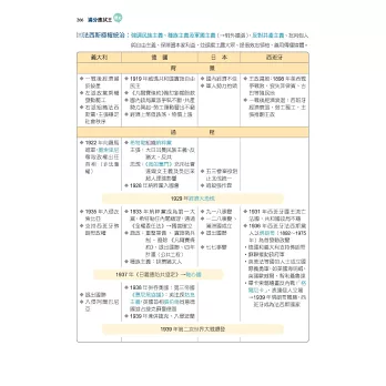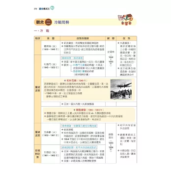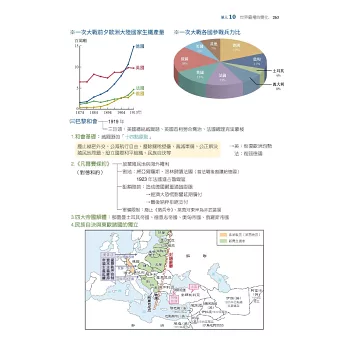 三、本書以主題式整理臺灣史、東亞史、世界史三大部分,並按照時間以表格、示意圖整理編排史事,以縱向時間軸的模式掌握歷史概念與知識;搭配史地不分家的觀念,以地圖及圖片帶出中西史事的貫通與聯繫,了解歷史空間的變化,呈現歷史的真實感。因應大考最新命題方向設計「比試身手」單元,不只讓您精進新題型的熟練度,更告訴您如何解題!加上精選「歷屆考題」方便同學在研讀每單元後能立即練習,掌握命題強調的歷史思維及史料解題的訣竅。