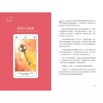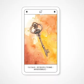 《預兆神諭卡》牌卡中前66張僅有數字編號,避免多餘文字訊息干擾直覺,著重培養你的直覺力,並引導你走向洞察和智慧。透過解讀每一張牌卡,你將學會抓住生活中的細微訊號,從而做出最適合自己的選擇。
