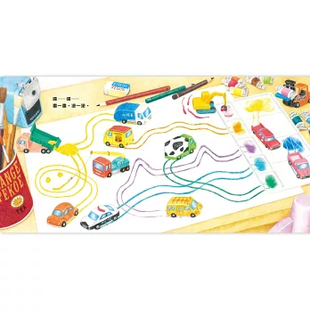 大人不在時,就是小汽車的自由時間!小汽車穿過了汪汪隧道,再爬上餐桌,彈一彈琴、畫一畫圖,啊!變得髒兮兮了,這趟冒險之旅最後會變得如何呢……