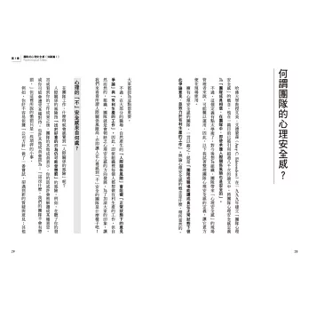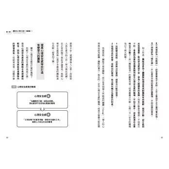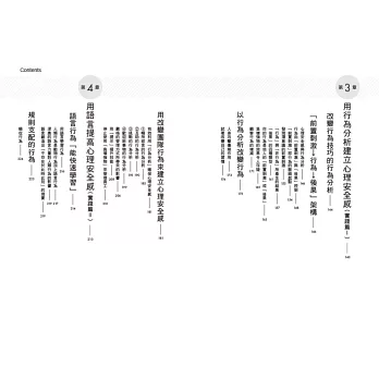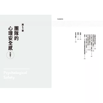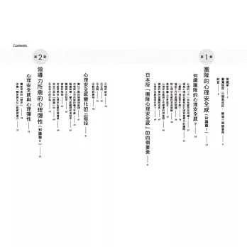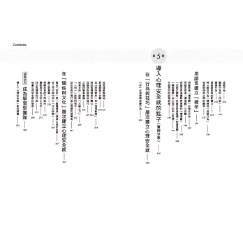 第一章說明「心理安全感」的定義及對組織的重要性,並提出符合東方社會文化的建構要素,第二章則是深入探討建立心理安全感團隊的基礎,也就是具有「心理彈性」的領導力,奠基於前兩章的理論知識,第三章及第四章分別提出具體打造心理安全感及心理彈性的實踐方法。第五章則以實際案例的作法,提供循序漸進的改造指南,幫助讀者建立具有合作力與創新力的團隊,並成為具有影響力的領導者。
