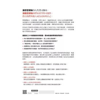 「賈林斯基從他開創性的學術研究中汲取靈感,逆向設計出激勵型領導的核心技能,並展現了即使是最令人憤怒的領袖,也能學會使周圍的人更上層樓。若你想成為更好的領袖、更好的父母或更好的人,本書是必讀之作。」──安琪拉.達克沃斯(Angela Duckworth),著有《恆毅力》
