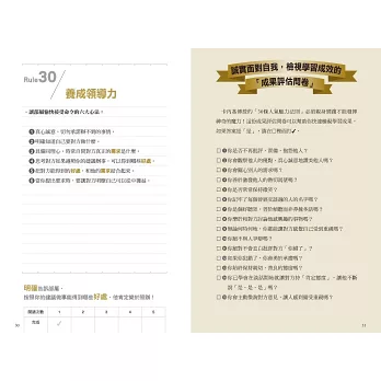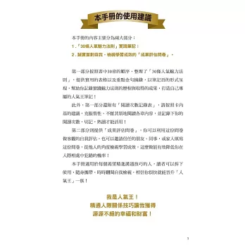 卡內基不斷強調書中的所有準則必須付諸實踐、靈活運用,才能發揮強大功效!原創手冊將按照書中30條人氣魅力法則的順序,提供實用的表格及金句摘錄,以筆記頁的形式呈現,幫助你記錄實踐的歷程與取得的成果,打造自己專屬的人氣王筆記!