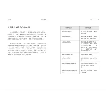 ● 關注學生個別差異:作者提及個人自身的童年逆境經驗,特別強調對於歷經創傷或處於壓力環境中的學生來說,為他們建立穩固安全感氛圍的重要性。書中透過實例說明建立安全的師生關係,如何表達深切的同理,並針對童年逆境孩童,提供具備創傷知情照護之能的正面建議等。