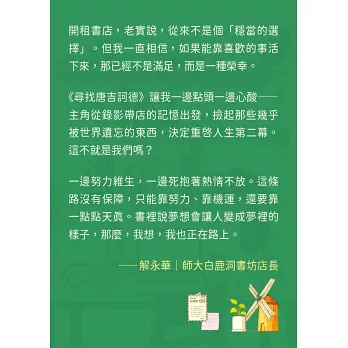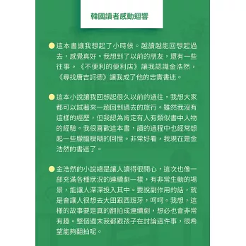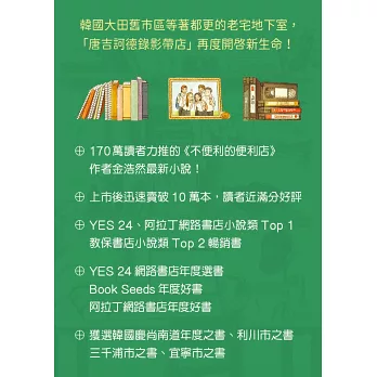 在《不便利的便利店》帶給我們溫馨故事的作家金浩然,這次以尋人「超級任務」為主軸,舞台從錄影帶時代延伸到YouTuber世界,並帶著他擅長書寫的「失敗者」角色,在一連串的跌跌撞撞中,再次帶來寫實卻不失幽默,讓人忍不住嘴露出滿足微笑的暖心故事。書中穿插懷舊與現代,對比主角小率和鬧失蹤的唐吉叔, 讓我們看見不同世代,追尋夢想的方式。而在作者溫暖的筆觸,和立體的角色描寫之下,其實不難讀出作者的深刻提問:在現實之前,我們是否仍有勇氣成為自己的「唐吉訶德」?並且,在追尋夢想的路上,更不會忘記當初為何出發?金浩然作家再次帶給我們一部不忘現實,也更加盈滿內心的療癒故事。順帶一提,原來韓國也曾經流行紅色跑車造型的錄影帶迴帶機呢。