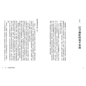 所有形式的佛教都與其他宗教和平共處,這一點吸引了全世界的目光。與其他宗教和平共處是佛陀傳達的核心訊息,我們每個人都應該遵循此一訊息,成為和平的使者,這是我們共同的連繫和紐帶。我希望本書能夠幫助世界各地的佛教徒放下自己所執著的觀點,彼此尊重地進行開誠布公的對話,此舉可能有助於一切眾生去體驗存在於其內的佛法真諦。當我們對佛法的熱忱受到慈心、悲心、喜心和捨心的引導時,我們就是在信守和榮耀佛陀的和平要務。