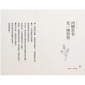 現在的我,連自己的陰影都愛。那些疾病的陰影,告訴我自己,唉,姑娘,妳還在。請如光一樣,好好愛你自己。……當我們學會向死而生,每一個看似倉促的句點,都會變成通向永恆的破折號。