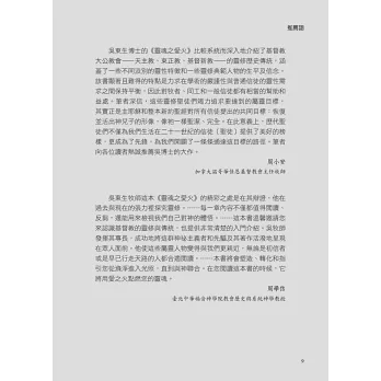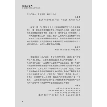 本書有許多精彩之處,第一,吳牧師詳細考察了書中人物的靈修教導及其所歸屬的傳統。不同時間和不同地點的交織,使得這些靈修教導有了實體和根基,這些教導不是抽象的靈性空談,而是又真又活的神學理論。第二,吳牧師也精彩描述了這些靈修的先鋒與神祕主義者。儘管今日新教界一般仍不信任或一直公然反對靈修生活的神祕面向,吳牧師仍大膽地將這些偉大人物稱作奧祕家,他告訴我們這些神祕主義者如何在日常生活中經歷和領悟神的強烈同在,他們的生命如何被耶穌改變,他們的著作如何都是關於跟隨耶穌、且浸透了祂的同在。第三,這本書證實了這群奧祕家和先鋒們留給我們的靈修教導,實實在在都是我們屬靈傳統的一部分。他們在當時都是真實活潑地與神同行,今日在神面前也仍是真實活潑地存在,使我們能夠活生生參與在基督教靈修的歷史中,也激勵我們、釋放我們,讓我們能夠在自己的時代裡效法前行。最後,每一章內容不僅都值得閱讀、反芻,還能用來檢視我們自己對神的體悟。回溯這群先鋒和神祕主義者的生命與教導,我們會發現自己受召要留心信仰的直覺面、心與智的整合,並要實踐真誠的團體紀律和成為見證者。與過去的接軌,會使我們前行時更堅強,成長時更堅定,對過去就像對現在一樣、對現在也會像對過去一樣更堅信。