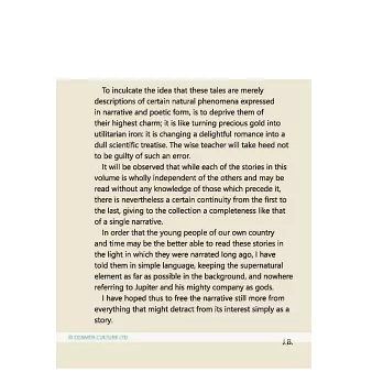 本書是一本經典的希臘神話入門書,作品揭示了希臘神話的精髓。作者以簡潔優美的語言,重新敘述了多則古希臘神話故事,適合各年齡層的讀者。這些故事不僅展現了神祇的力量與人性的光輝,也傳達了勇氣、智慧與犧牲的價值觀。