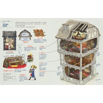 另外,針對房屋外觀風貌,與內部生活痕跡及道具等細節,加上手寫體的文字風格,以主人公步荷豬的語調,用詼諧幽默的口吻解說,引領讀者站在他的角度,來一場沉浸式的城鎮漫旅。