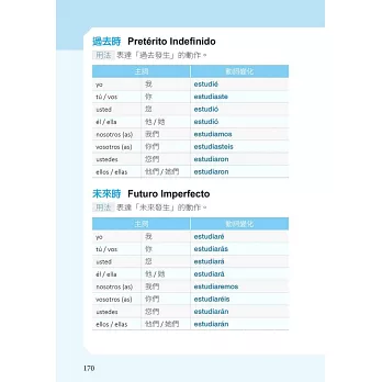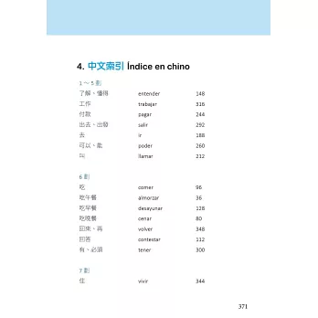 您還可以透過附錄的西語動詞中文索引,快速找到該動詞所在頁數。這些嶄新的設計,讓您在學習西語動詞時更有效率!