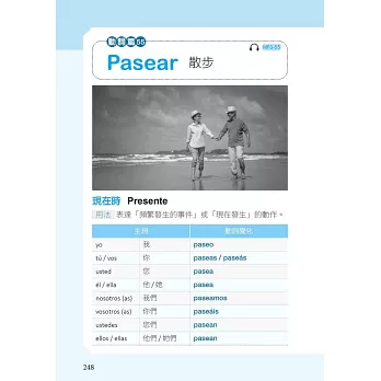 全書80個動詞都搭配情境插圖,幫助您輕鬆記憶, 表格中更納入中南美洲慣用的「vos」(你)之動詞時態變化,讓您在本書學到的動詞變化,可以通用於所有西語系國家!