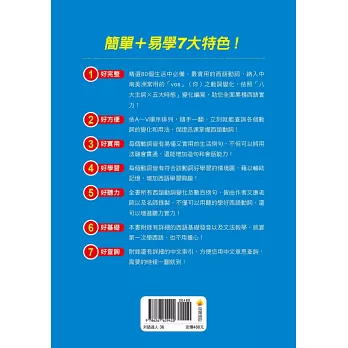 本書設計成便於翻閱查詢的開本,搭配QR Code隨時掃瞄聆聽音檔,讓您方便進行學習安排。80個動詞按照西語字母順序A~V編排,可以輕鬆查詢動詞所在頁數。