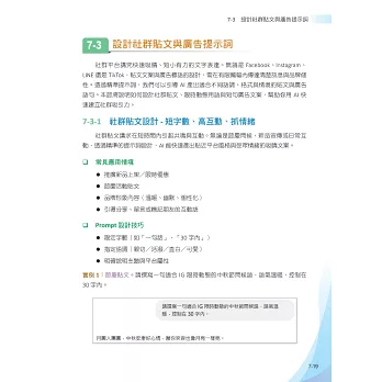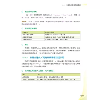 針對不同AI應用場景,包含ChatGPT、圖像生成、音樂創作、影片編排等,給出具體的Prompt設計技巧和範例,強調立即可用、容易複製的實戰導向。