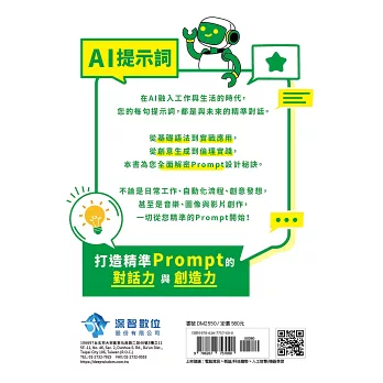 這是一本深入又實用、理論與實戰並重、並關注未來趨勢的AI Prompt專書。無論你是想要學AI溝通、加速工作、提升創造力、規避風險,還是追求AI職涯新方向,這本書都能幫助你全面掌握Prompt設計的關鍵技術,為你在AI時代搶得先機!
