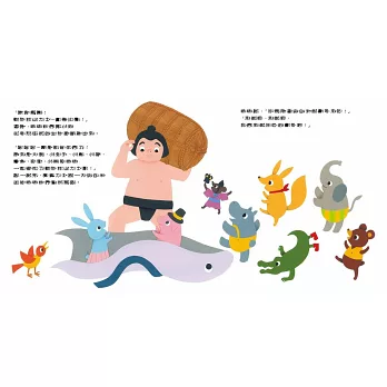 「贏得相撲比賽獲得一包白米,接著用這個獎品自己做壽司來吃,然後大家還一起泡澡。豐富多彩的故事,介紹如何煮壽司飯,以及如何製作握壽司、捲壽司和散壽司。不只是一本食育繪本,也做了很多日本文化的介紹。」──日本讀者好評2