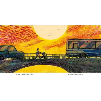 另一幕,趴在榻榻米上的孩子抬頭望向夕陽,手中的書頁上印著的文字,正是日本昭和年代詩人吉野弘的著名詩作〈熟透的一天〉:「宛若紅色西瓜內部的夕陽,夏日裡,也有像這樣熟得恰到好處的一天。天上的那位,是不是正用大湯匙,一勺一勺地撈起夕陽來品嚐?那看似甜美的紅色部分,正慢慢地減少。」這首關於黃昏的詩,令他們深受感動,決定將其放入繪本之中。