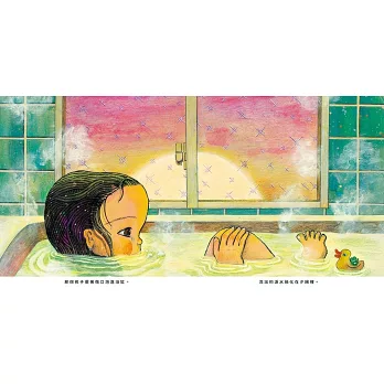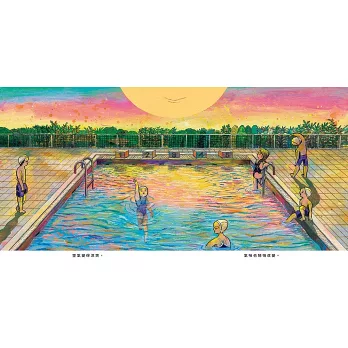 《融化在夕陽裡》這本書,由一幕幕浪漫的晚霞時光及輕巧詩意的文字交織而成,以濃厚的氛圍感取代明確的情節鋪陳。在廣闊的天空中,耀眼的太陽緩緩下沉,將一切染上金色,空氣變得清涼,遠處傳來柔和的聲音。無論是在稻田裡、泳池旁、公園的攀爬架,和媽媽一起回家的路上,或是獨自一人待在房間裡,夕陽總會來到每個孩子的身邊。