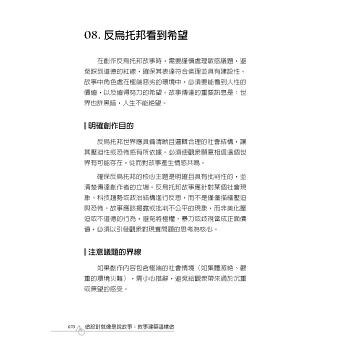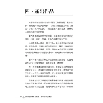 本書前四篇為:「敘事建築」、「設計思考」、「操作方法」與「產出作品」,用20個單元進行說明。讀者可以根據操作過程的需求,挑選單元閱讀,學習理論以及步驟方法,並根據各單元提醒的要點完成操作。本書最後一篇是「作品案例」,收錄作者指導的學生其中四位的作品。