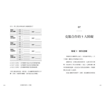 書中內容深度剖析了腐蝕團隊的「喪失信賴」、「害怕衝突」、「缺乏承諾」、「規避責任」、「忽視成果」5大障礙,更提供讓團隊成員上下一心的實作工具,例如團隊評估量表、個人歷史演練、性格與行為取向分析等,無論你是一個部門、一家公司的領導人,抑或你是一個希望得到信賴、支持、安全感的團隊成員,都可以在本書中看到自己的影子,悟出幫助團隊運作的技巧和法則。